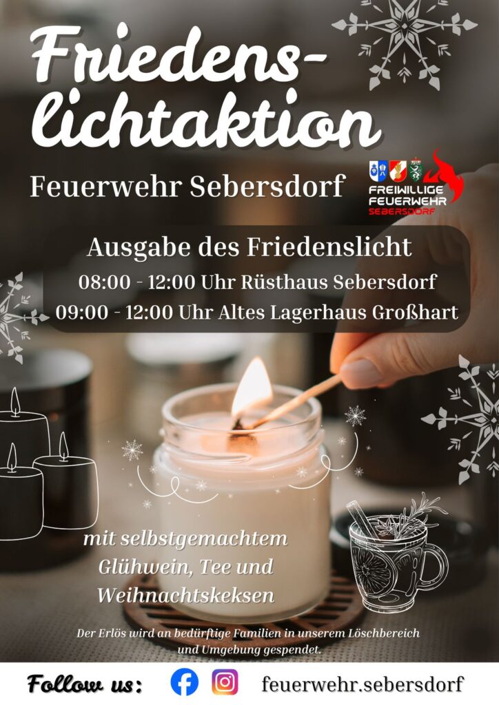 Am Mittwoch, dem 24.12.2025, kann das Friedenslicht ab 08:00 Uhr beim Rüsthaus Sebersdorf sowie von 09 bis 12 Uhr beim ehem. Gemeindeamt Großhart abgeholt werden.