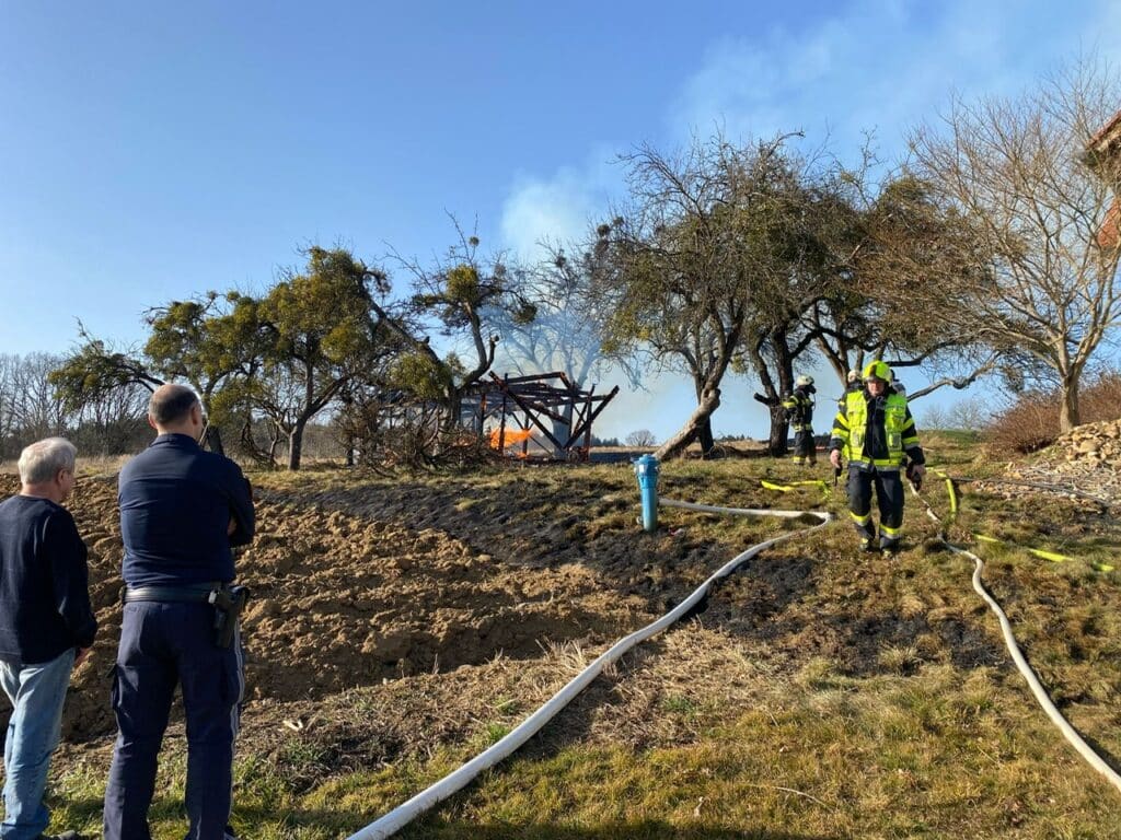Aus bisher unbekannter Ursache kam es bei einer Holzhütte in Geiseldorf zu einem Brand. Am Einsatzort eingetroffen stand die Hütte in Vollbrand und auch die angrenzende Wiese samt der Bäume brannte zum Teil ebenfalls.
