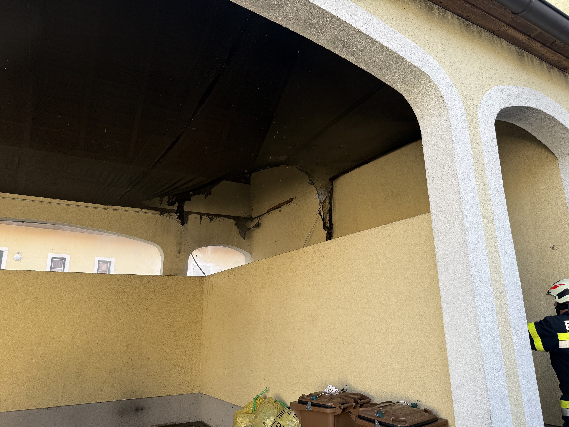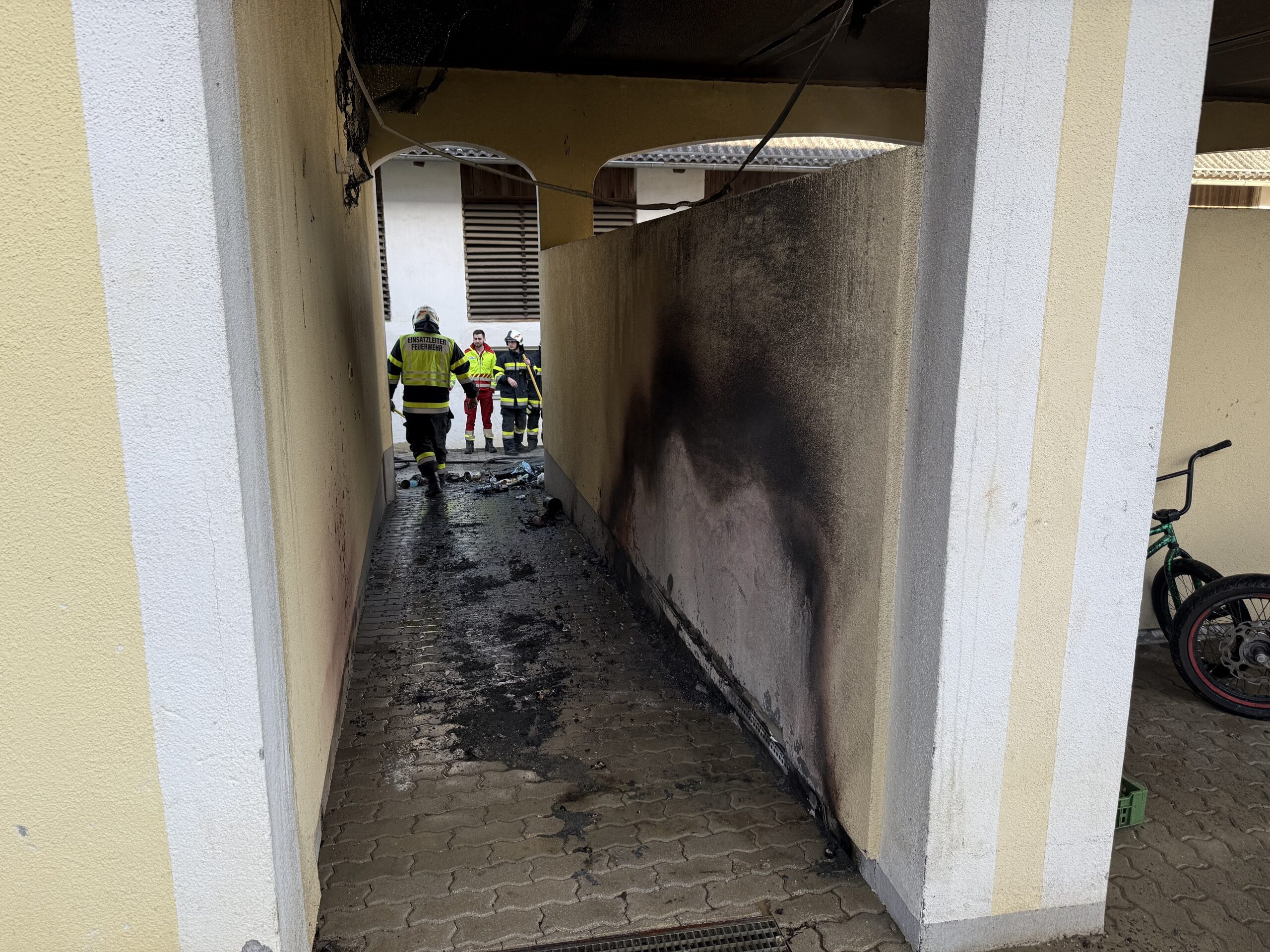 Aus bisher unbekannter Ursache kam es bei einem Wohngebäude in einem Abstellplatz für Mülltonnen zu einem Brand. Dabei standen mehrere Mülltonnen in Flammen.