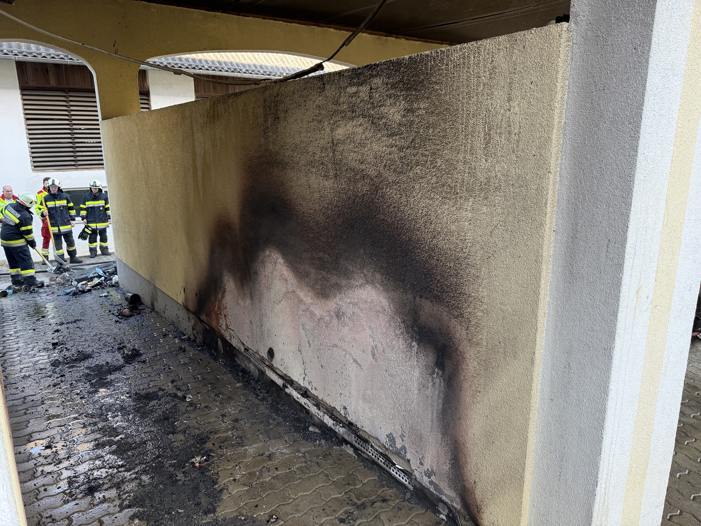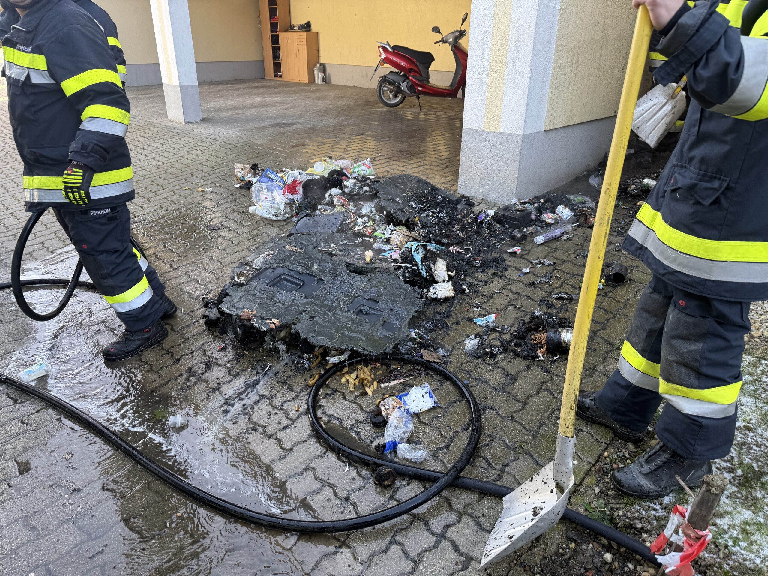 Die Feuerwehr Sebersdorf löschte den Brand mittels HD-Rohr und räumte anschließend den abgebrannten Müll aus dem Abstellplatz, um diesen gezielter ablöschen zu können. Dabei wurde der Müll und der Abstellplatz samt Umgebung mittels Wärmebildkamera kontrolliert um weitere Glutnester finden zu können. Der Abstellplatz wurde anschließend noch mit Wasser gekühlt um einen weiteren Brand zu verhindern.