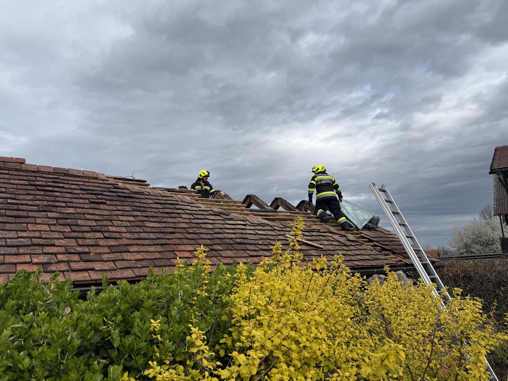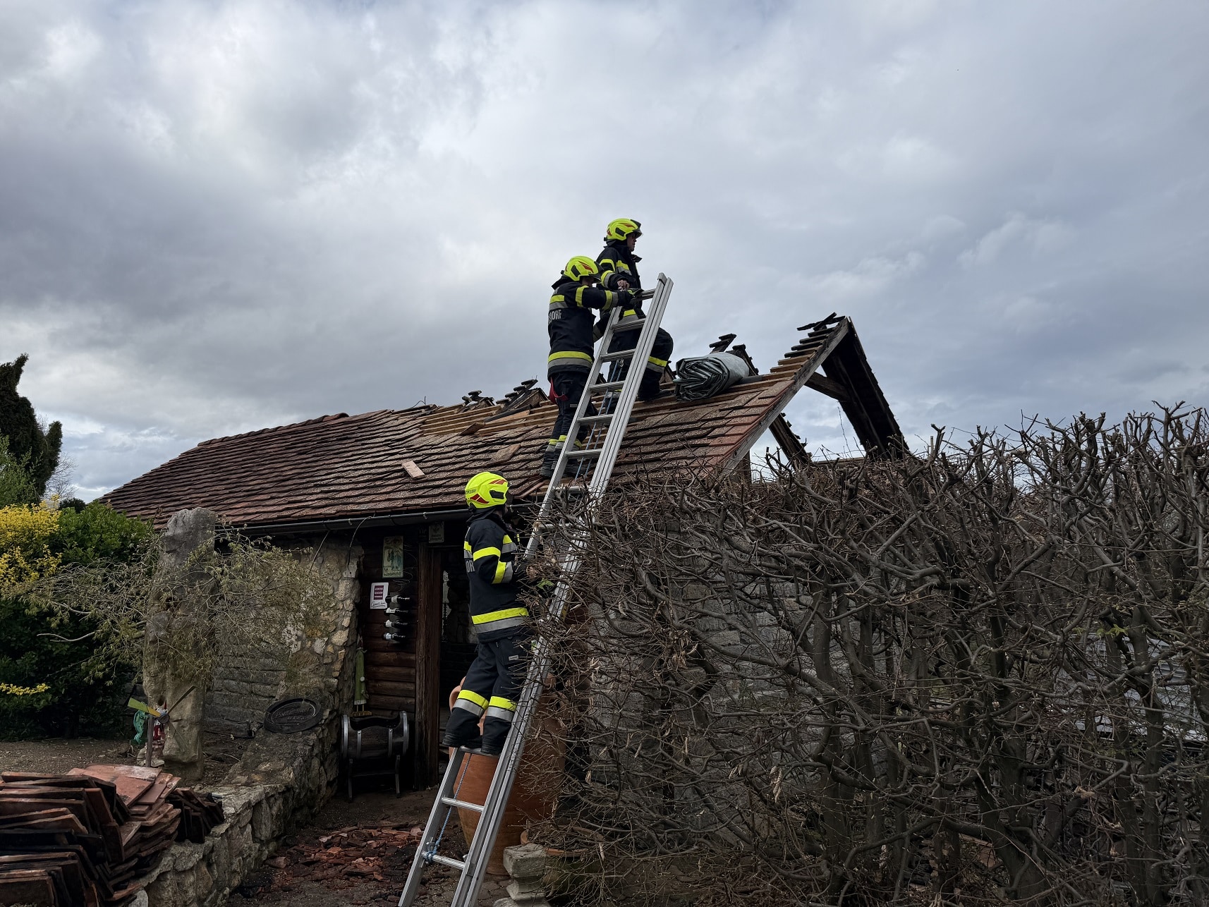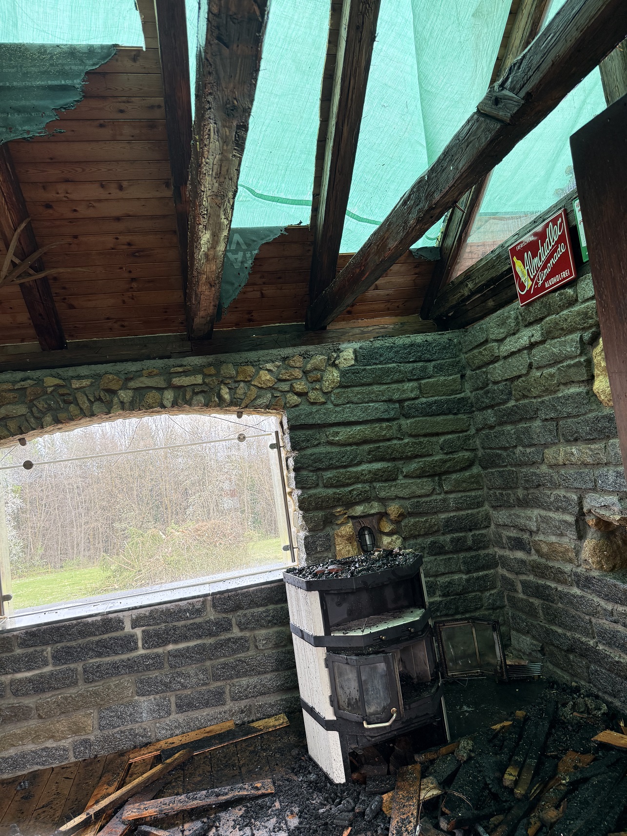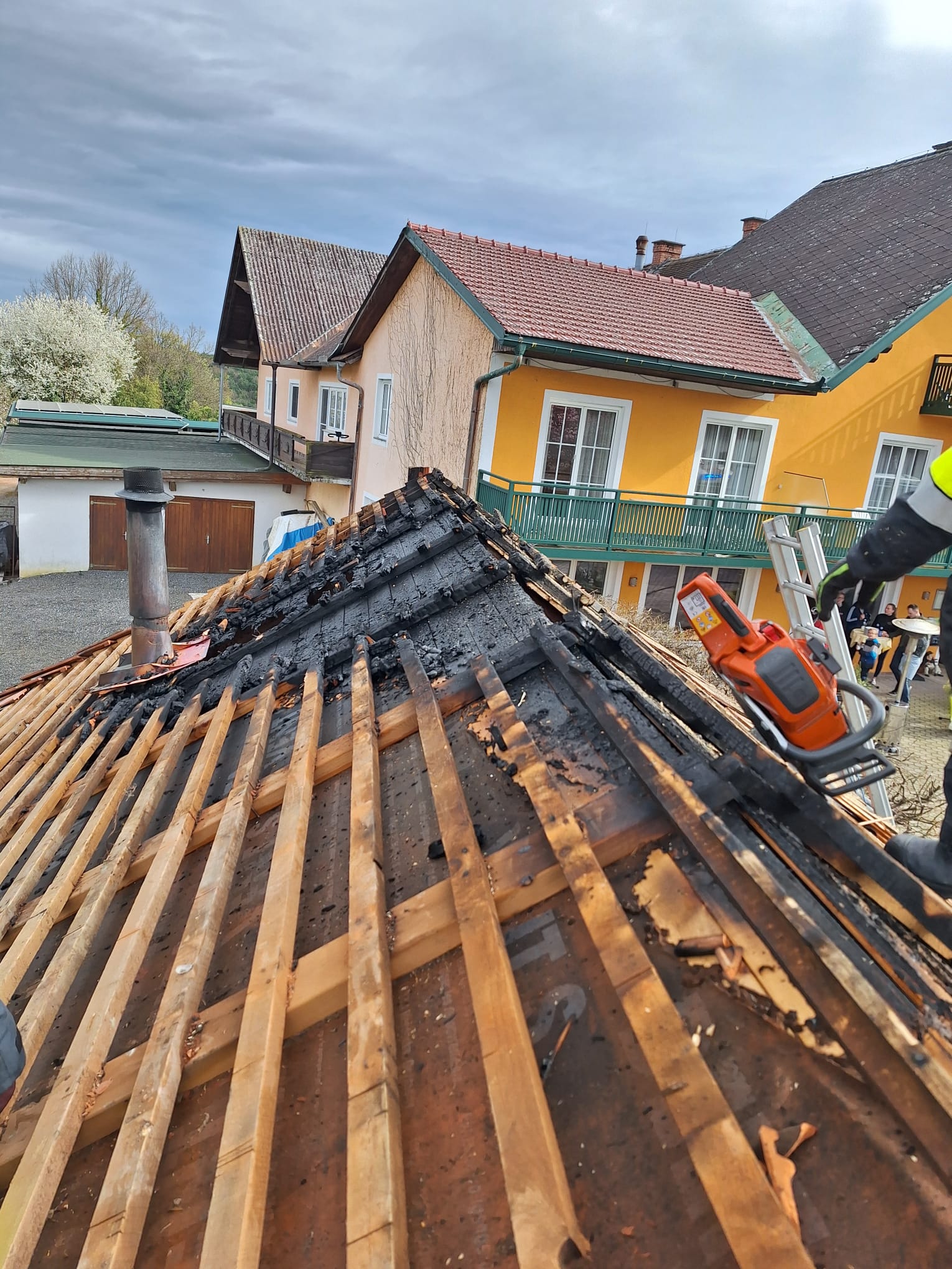Nach den ersten Löscharbeiten wurde das Dach auf beiden Seiten geöffnet um alle Glutnester zu erreichen. Nachdem der Brand komplett gelöscht war, wurde das Gebäude ausgeräumt und die angebrannten Holzelemente vom Dach mittels Motorkettensäge entfernt. Anschließend wurde das Dach mit einer Plane abgedeckt.