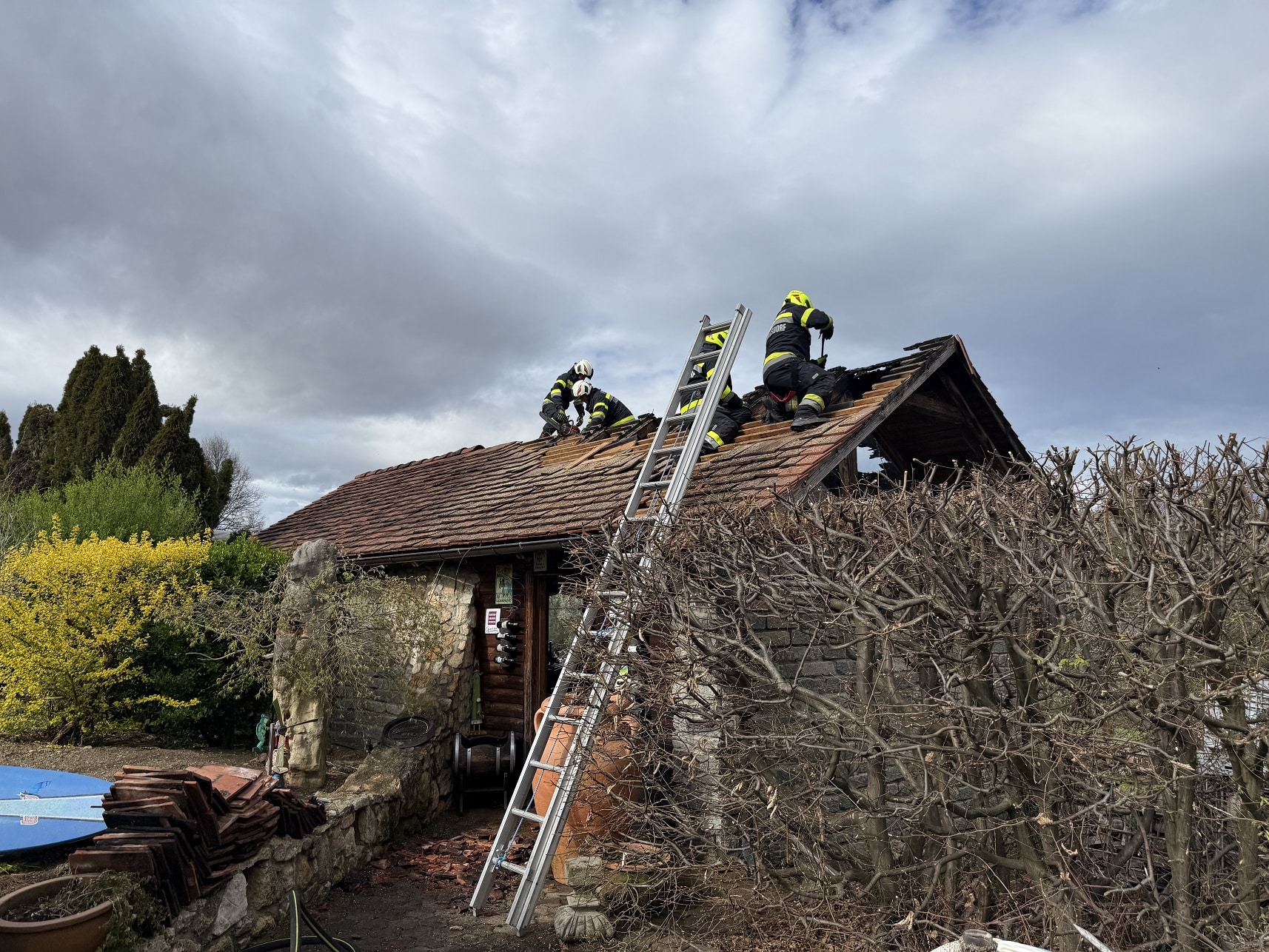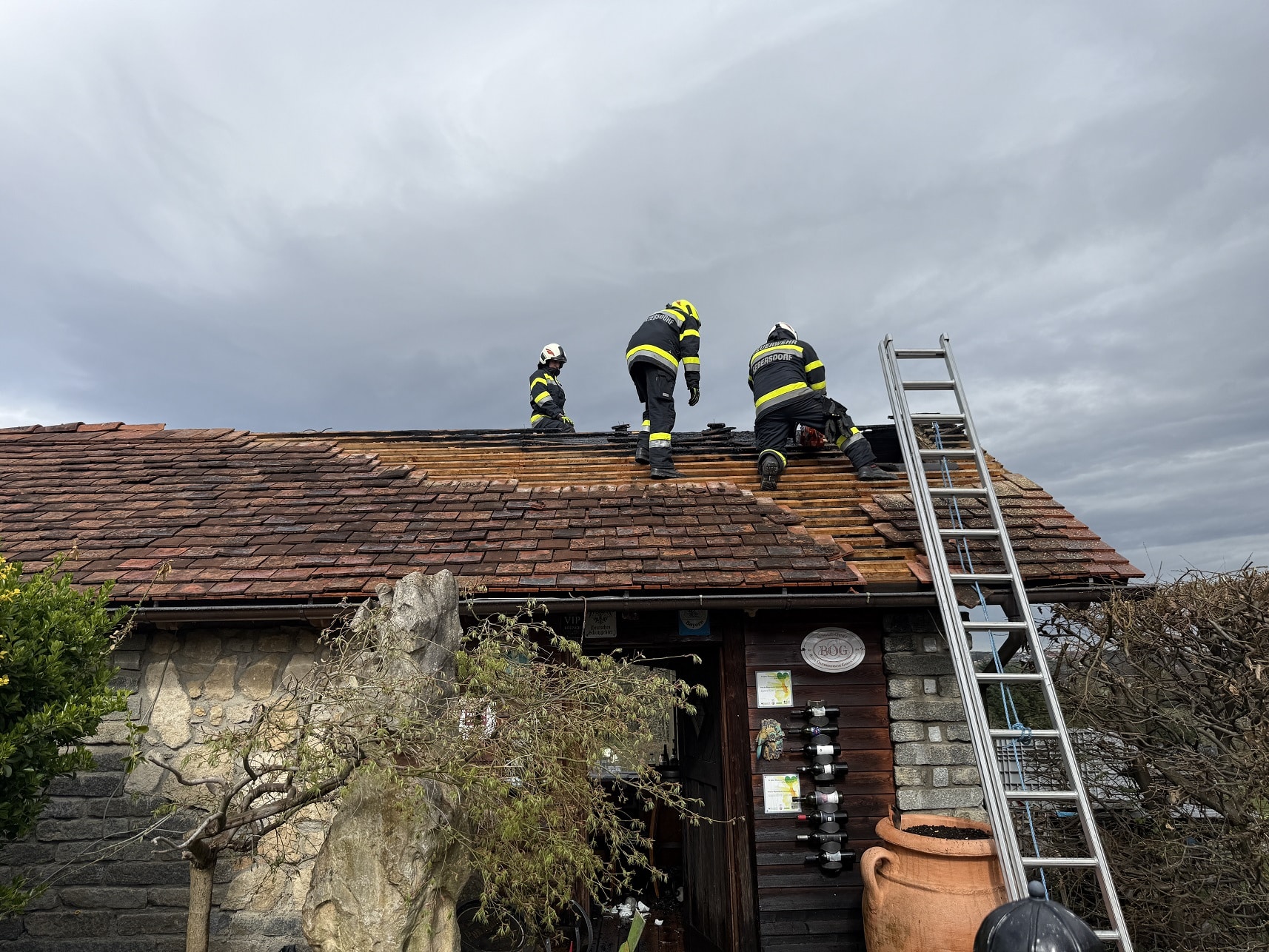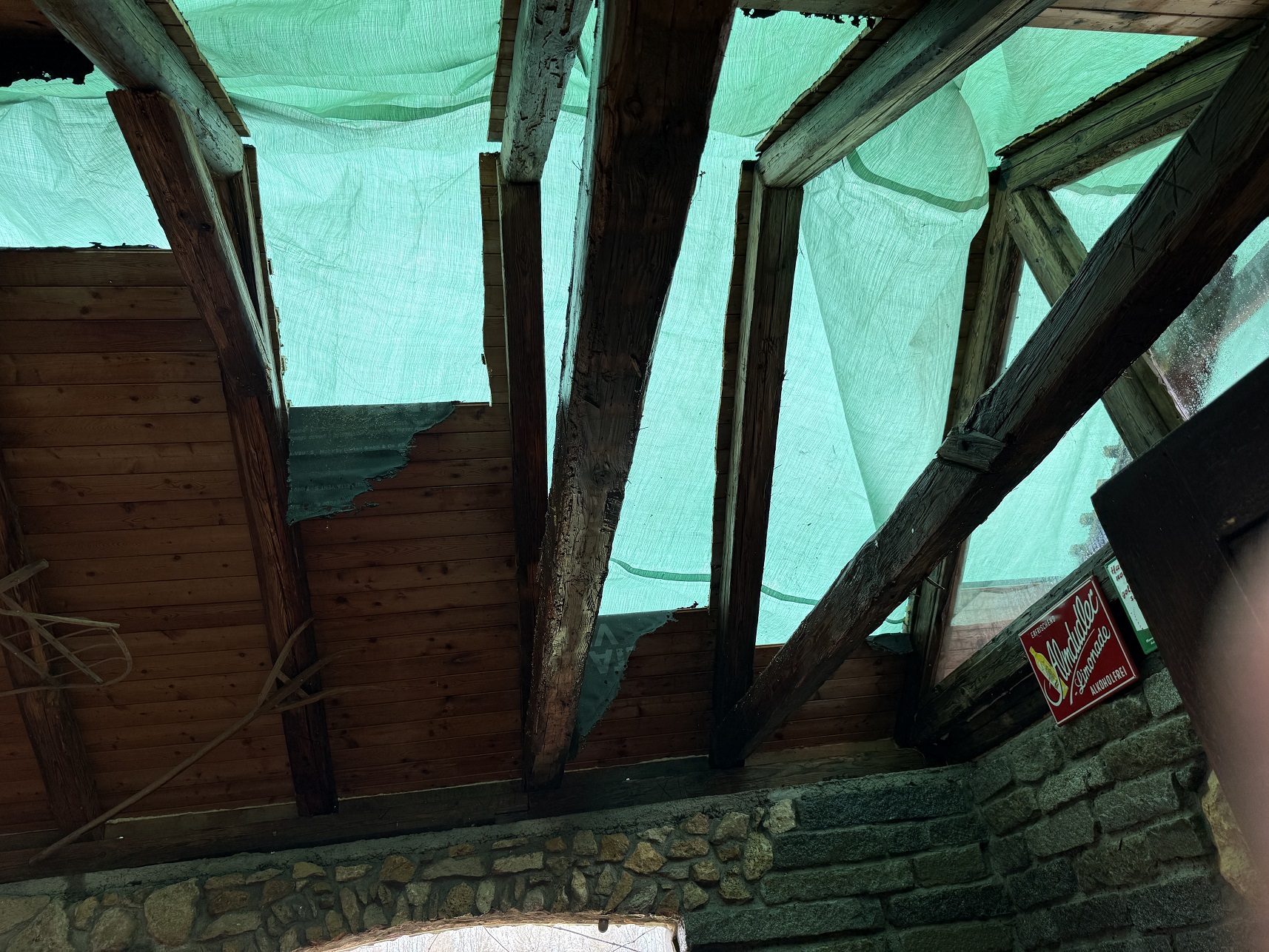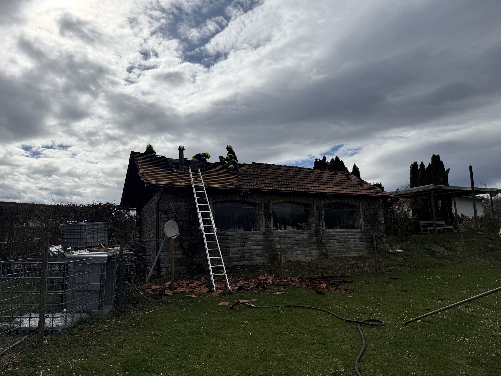 Nach den ersten Löscharbeiten wurde das Dach auf beiden Seiten geöffnet um alle Glutnester zu erreichen. Nachdem der Brand komplett gelöscht war, wurde das Gebäude ausgeräumt und die angebrannten Holzelemente vom Dach mittels Motorkettensäge entfernt. Anschließend wurde das Dach mit einer Plane abgedeckt.