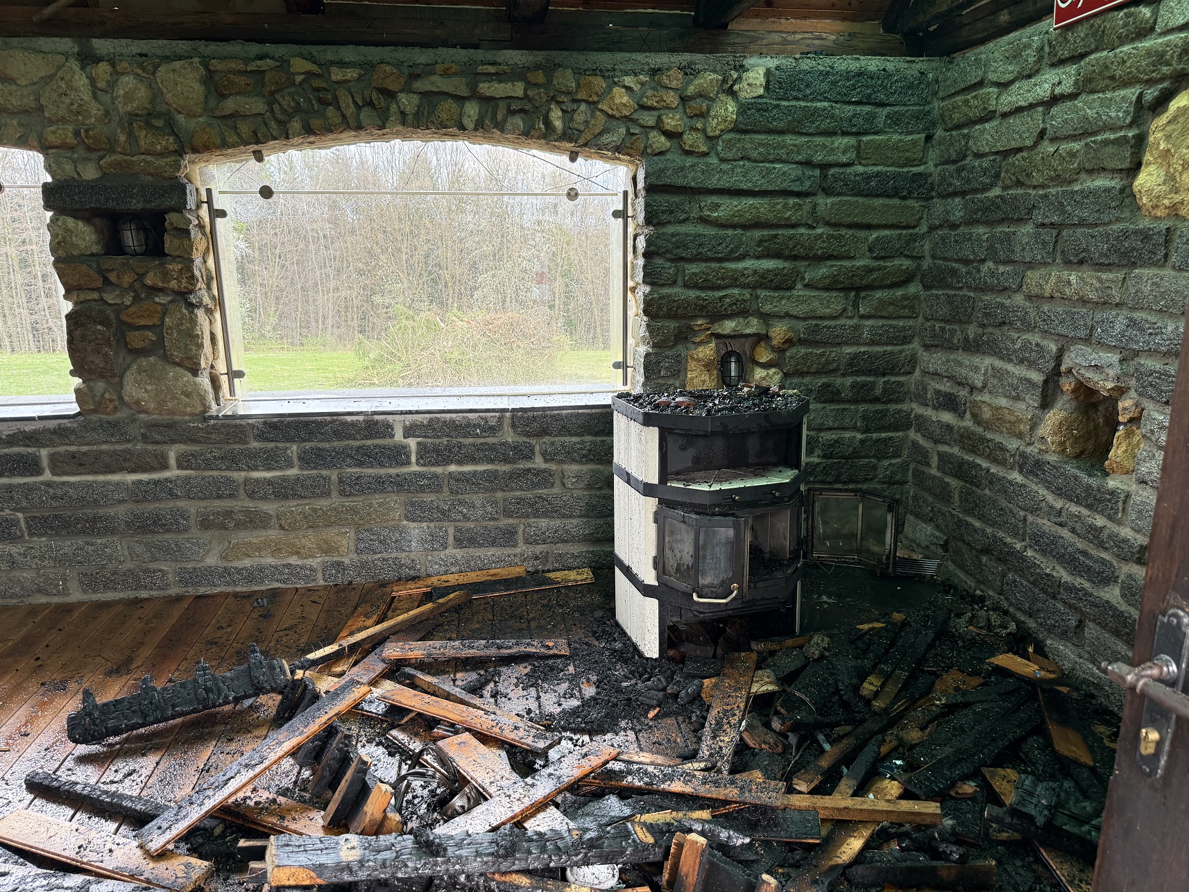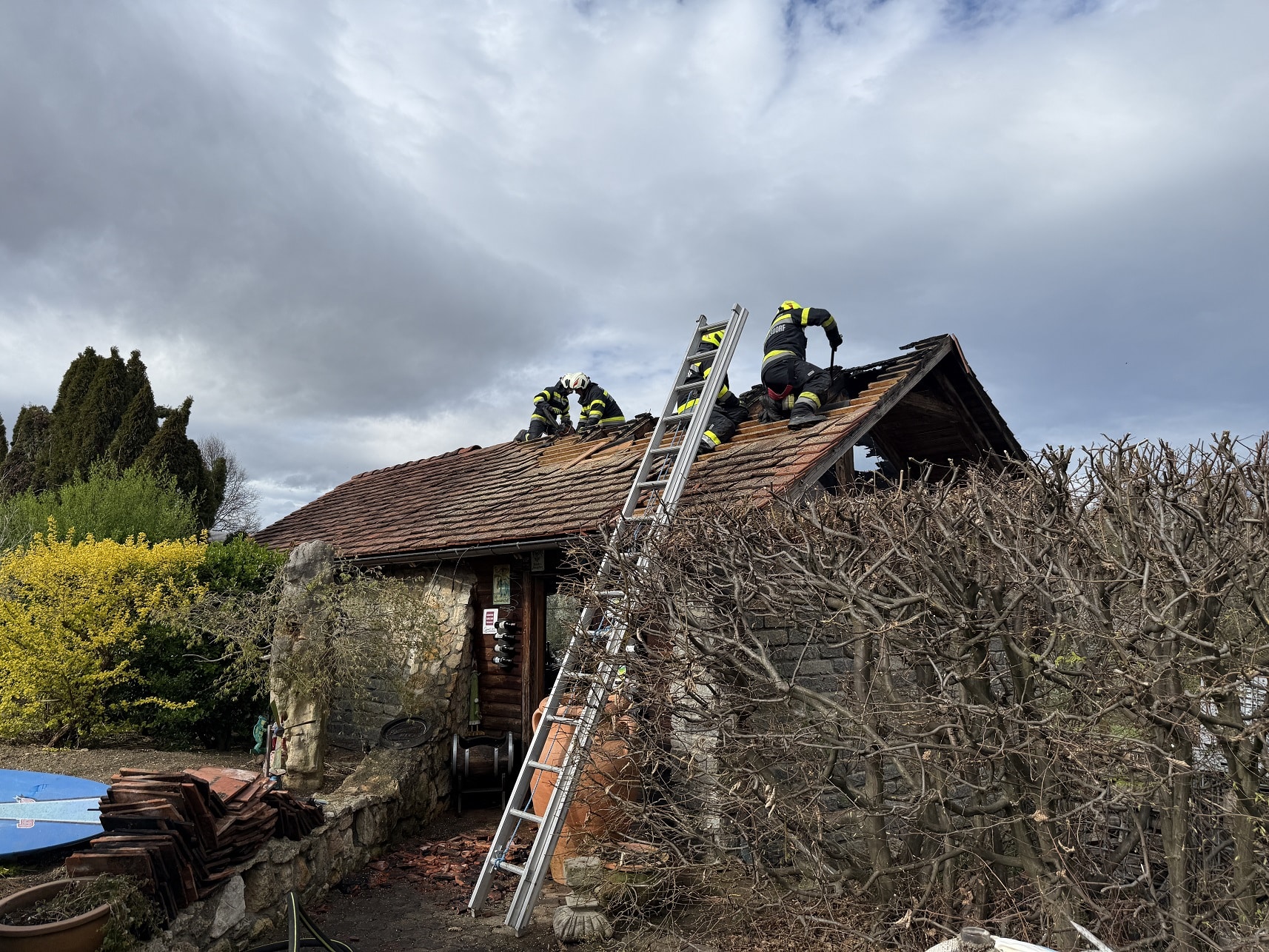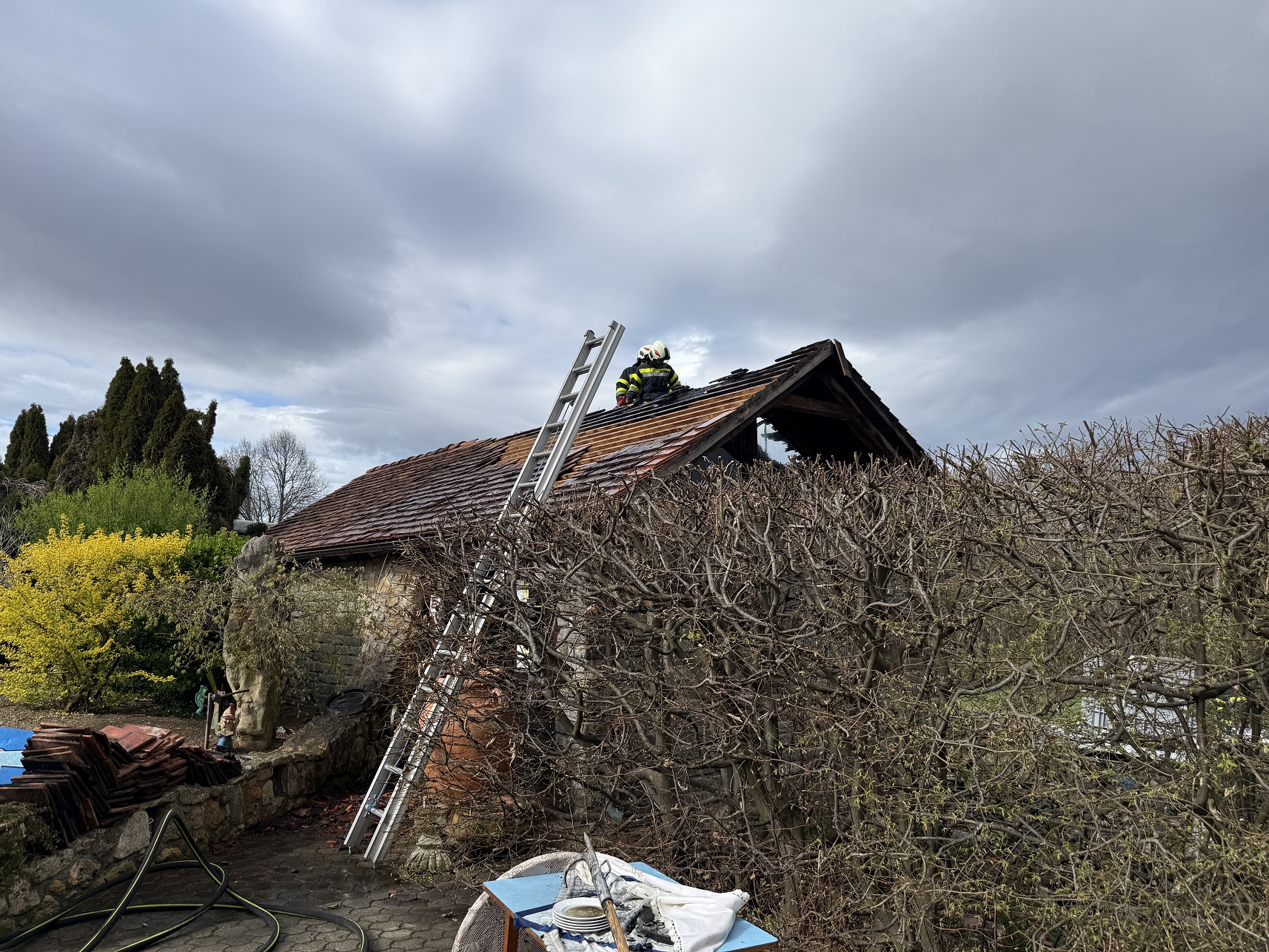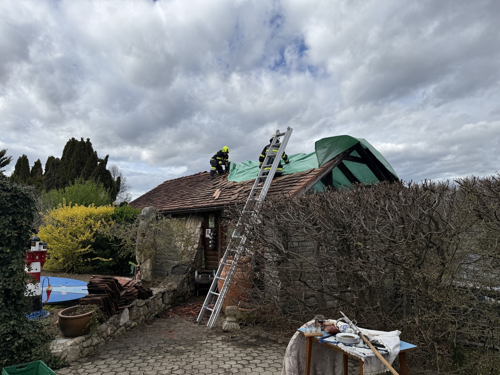 Nach den ersten Löscharbeiten wurde das Dach auf beiden Seiten geöffnet um alle Glutnester zu erreichen. Nachdem der Brand komplett gelöscht war, wurde das Gebäude ausgeräumt und die angebrannten Holzelemente vom Dach mittels Motorkettensäge entfernt. Anschließend wurde das Dach mit einer Plane abgedeckt.