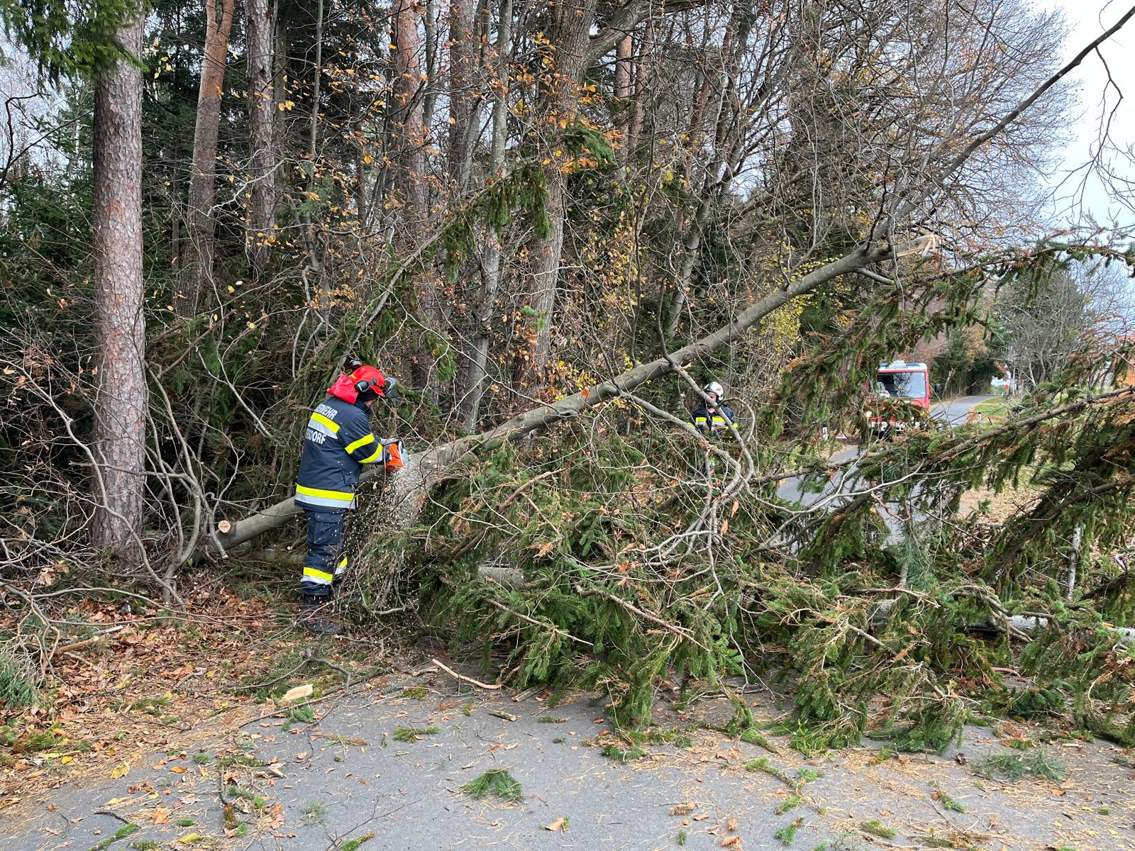 Die Feuerwehr Sebersdorf entfernte den Baum mittels Motorkettensäge und reinigte anschließend die Straße