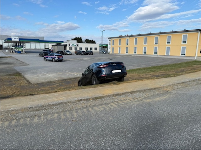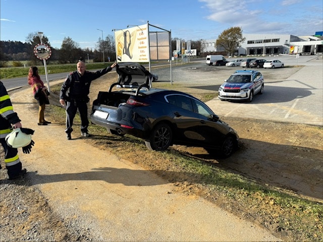 Aus bisher unbekannter Ursache kam ein PKW bei der Ausfahrt vom McDonalds von der Straße ab und landete im Straßengraben.